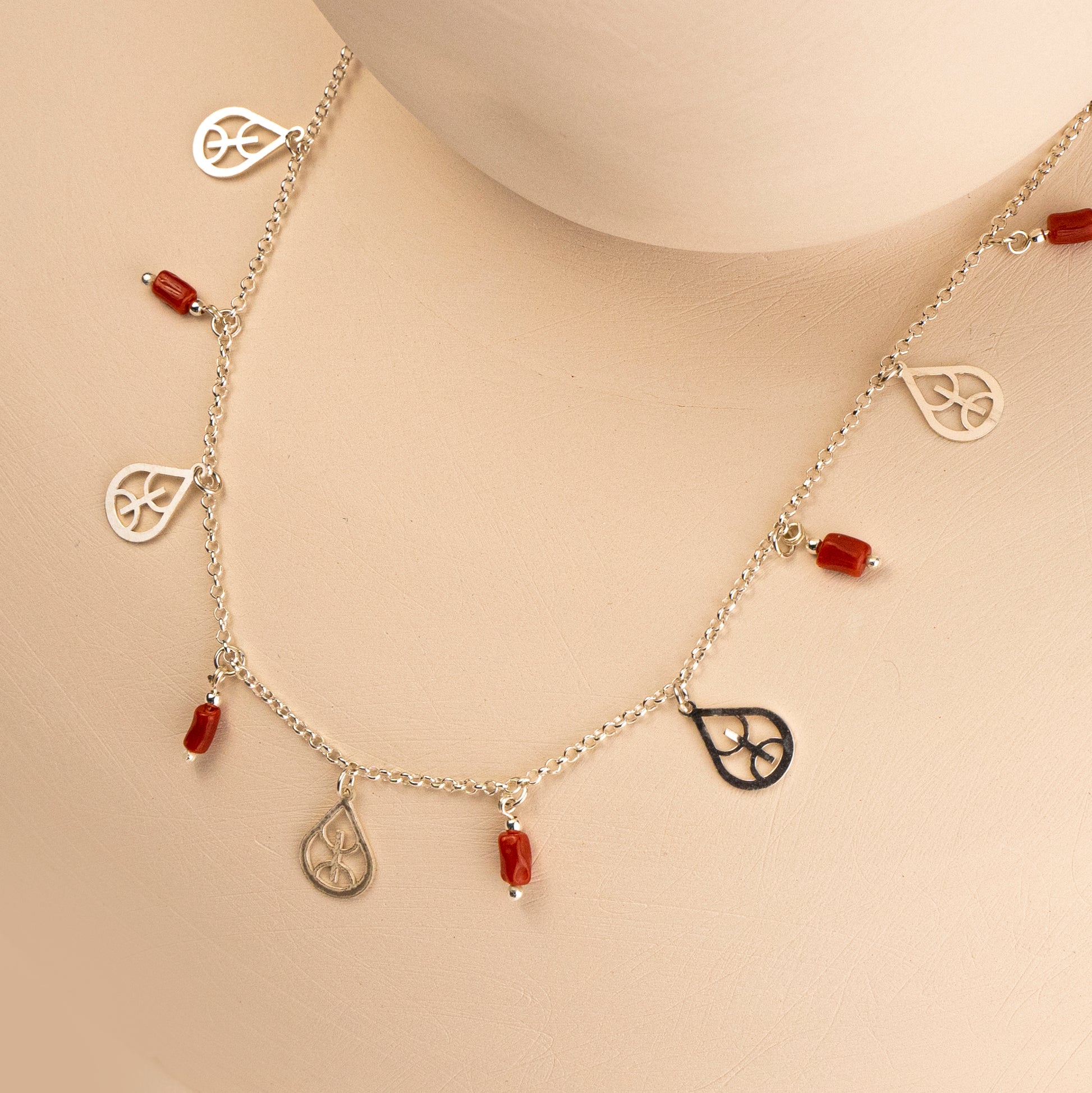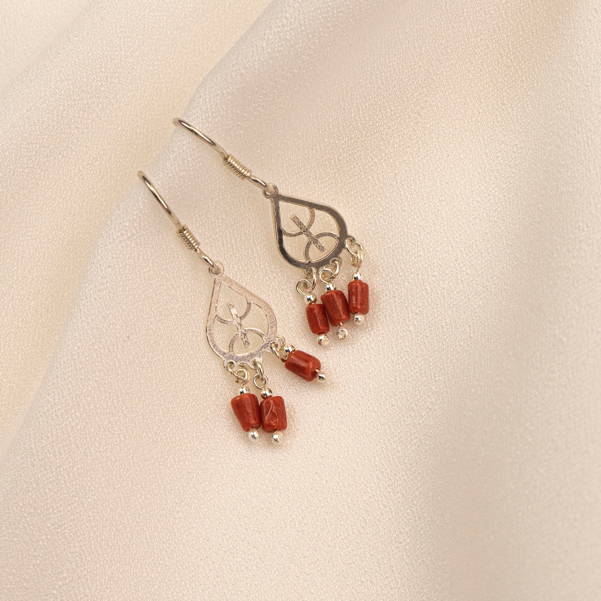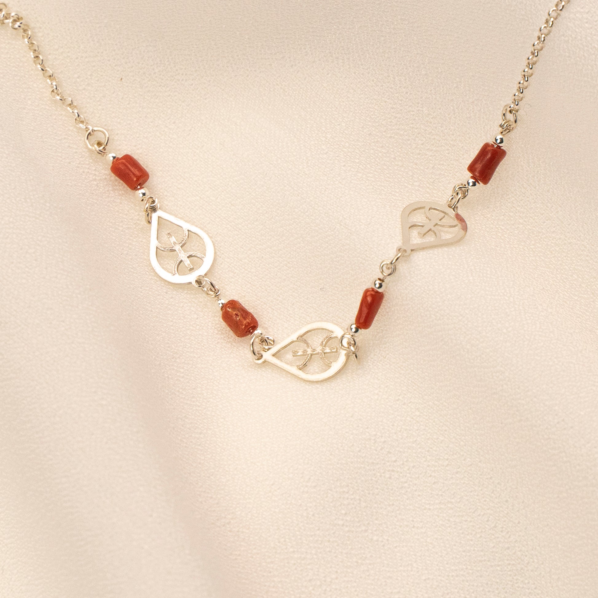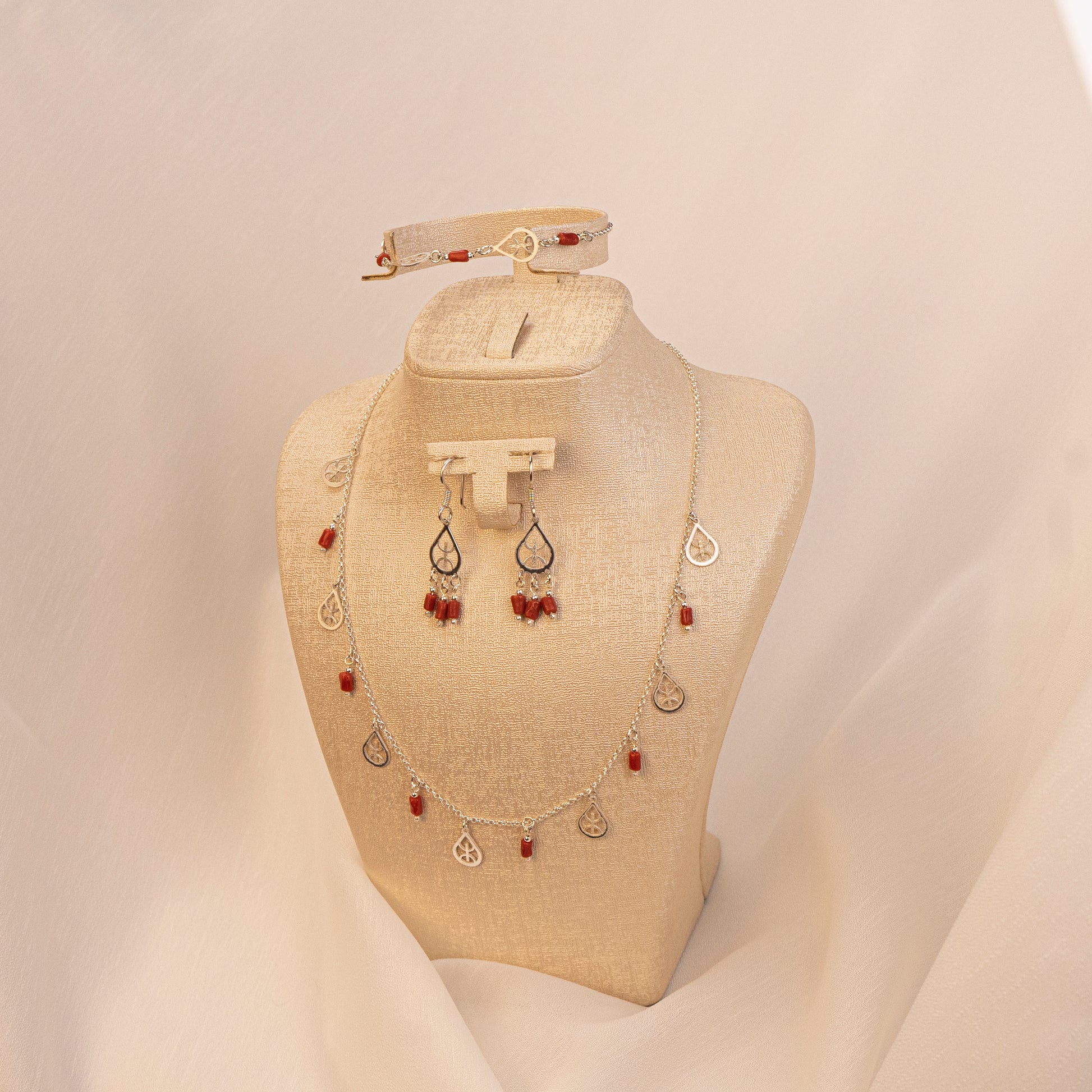 Trio composé en une chaine, des boucles d'oreilles et une gourmette en argent massif 950 et corail brut.