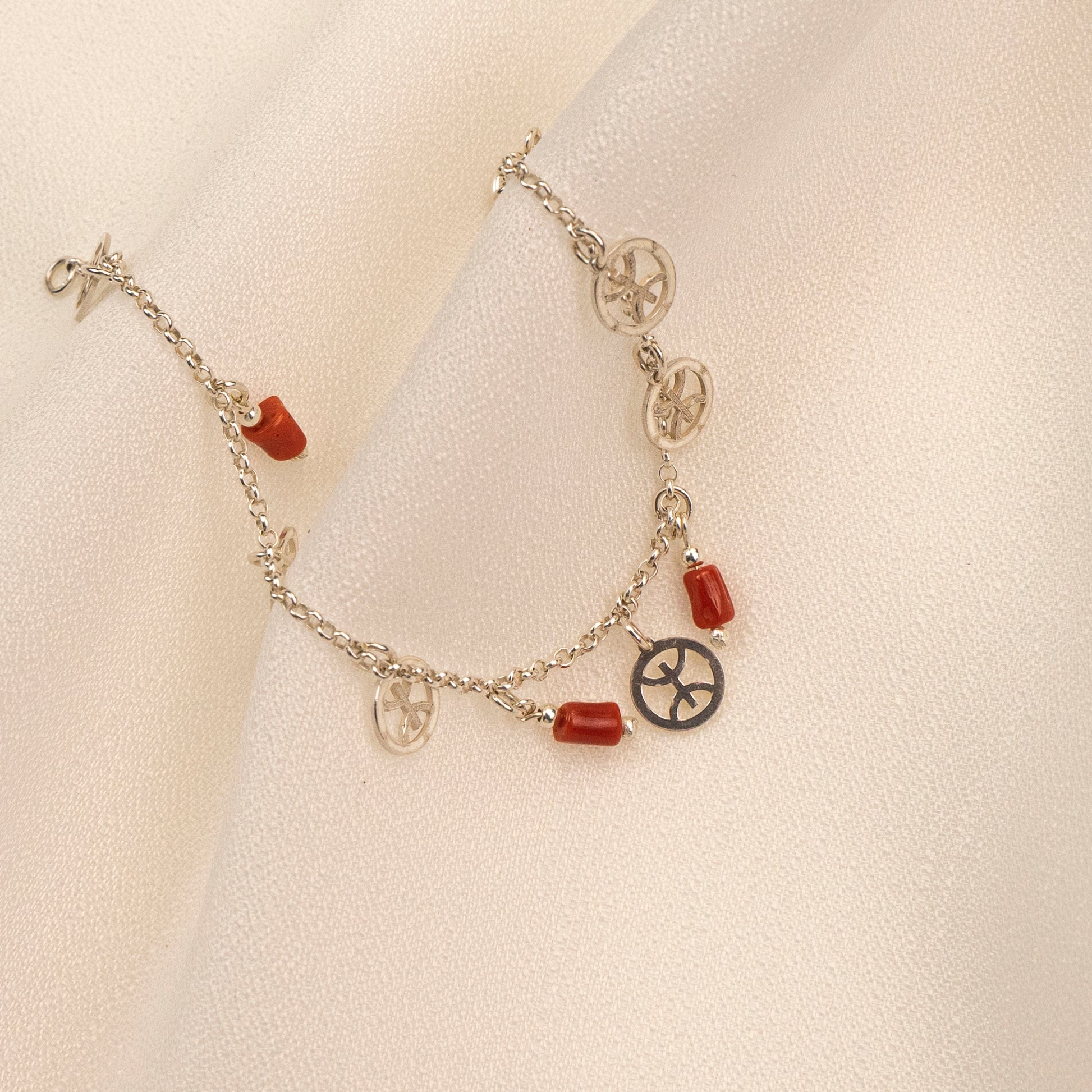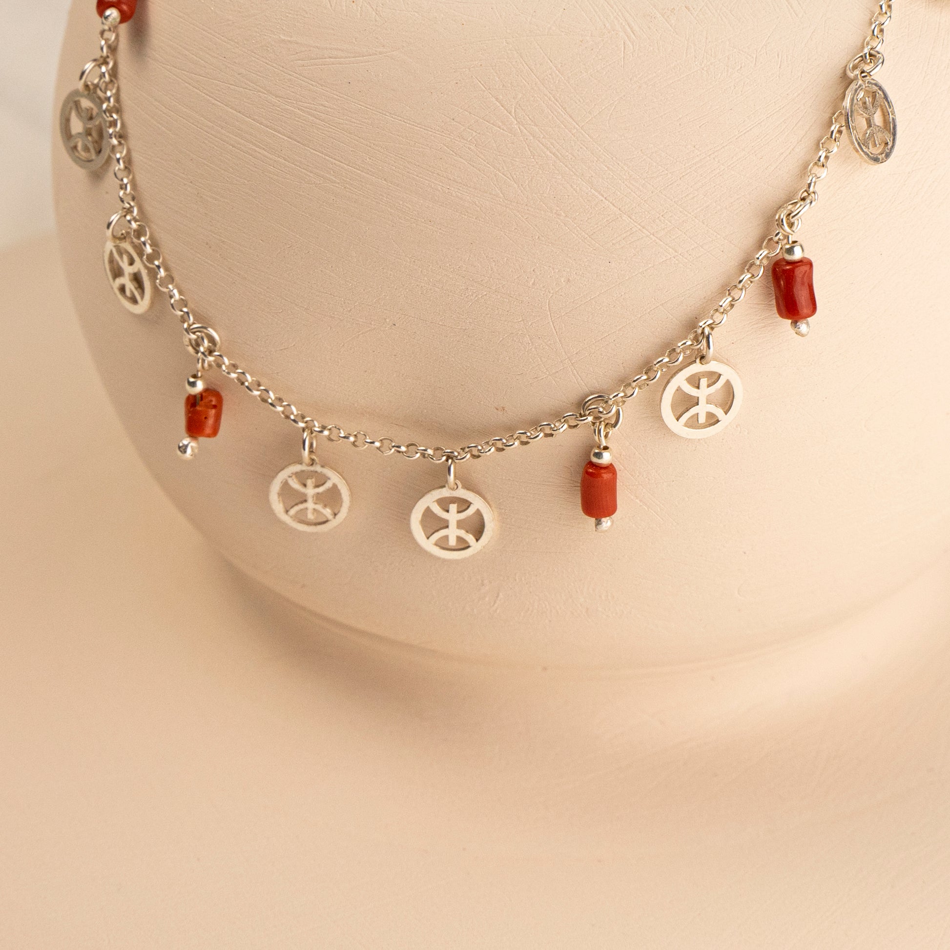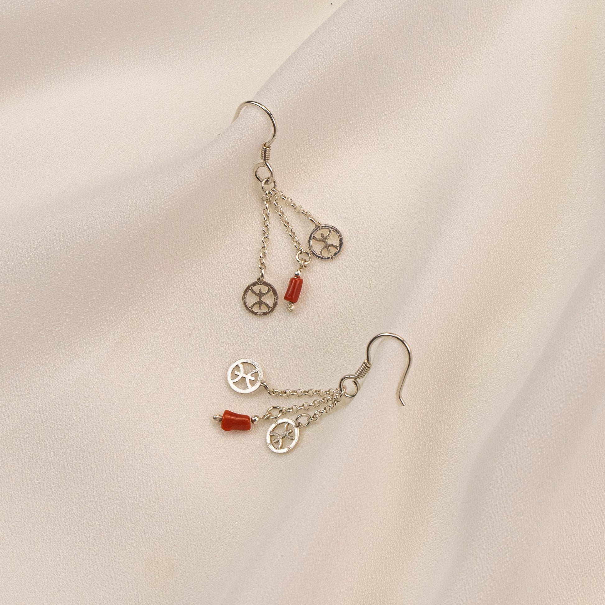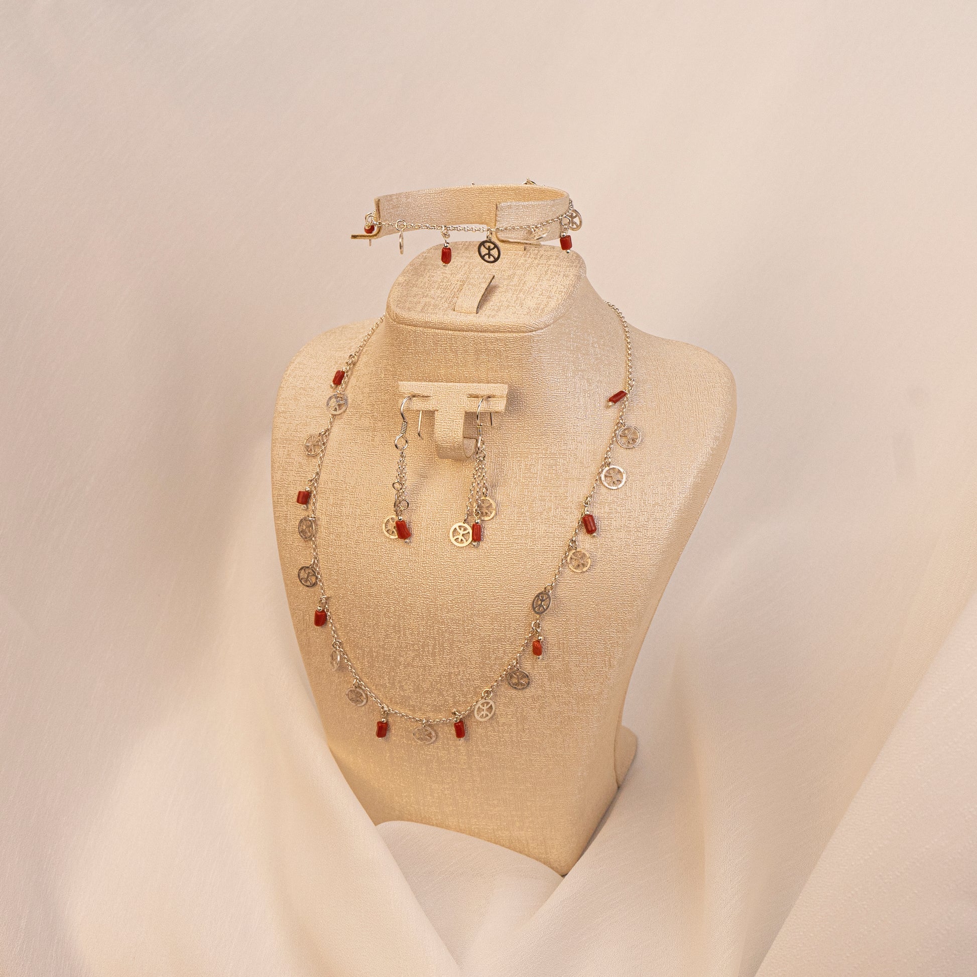 Trio composé en une chaine, des boucles d'oreilles et une gourmette en argent massif 950 et corail brut.